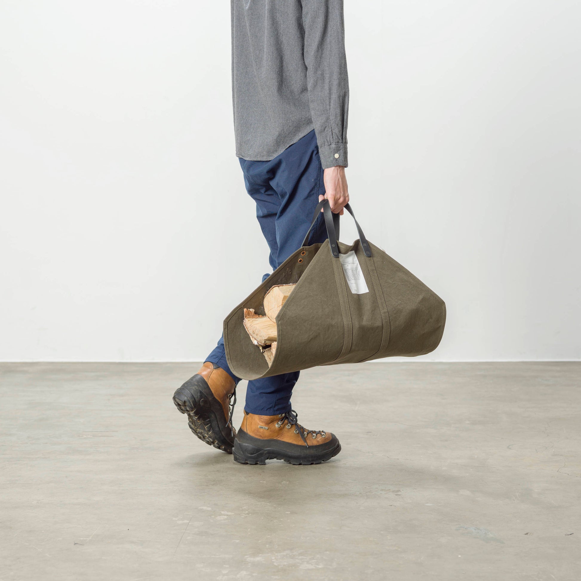 パラフィン加工を施した帆布とレザーを組み合わせたログキャリヤ。